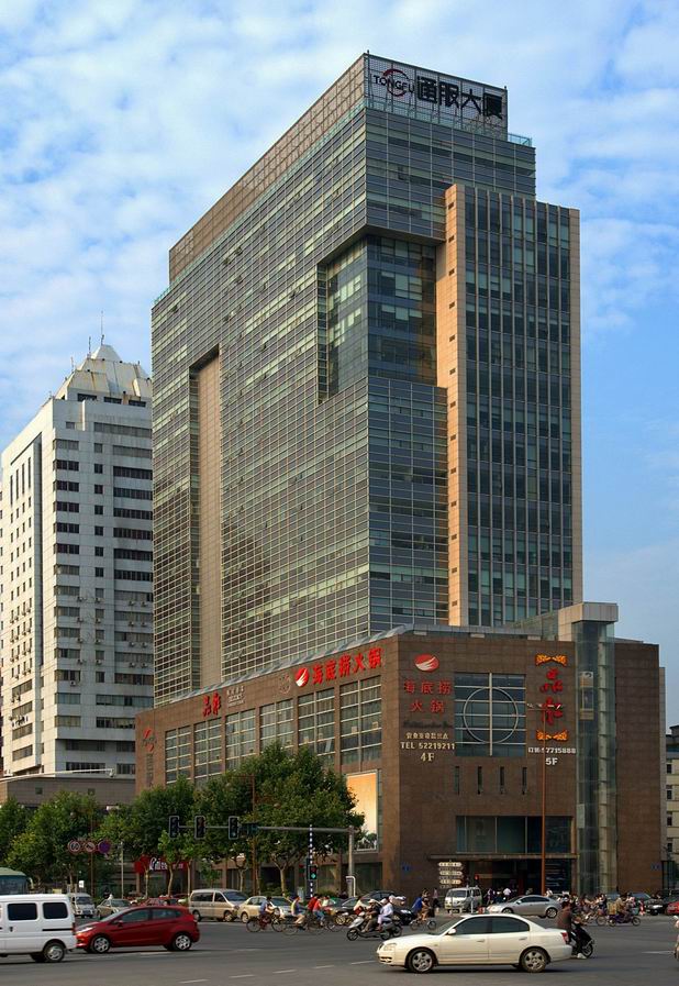 通服大厦地处南京中山南路、夫子庙商圈黄金交汇处,是一栋现代化的商务办公综合楼,大楼造型优美挺拔,理性的形体有力而简洁,配合浪漫诗意的幕墙表面机理,更增添了现代建筑的魅力。工程建筑面积46352.99㎡,框筒结构,地上22层,地下2层,建筑最大高度86.9m。